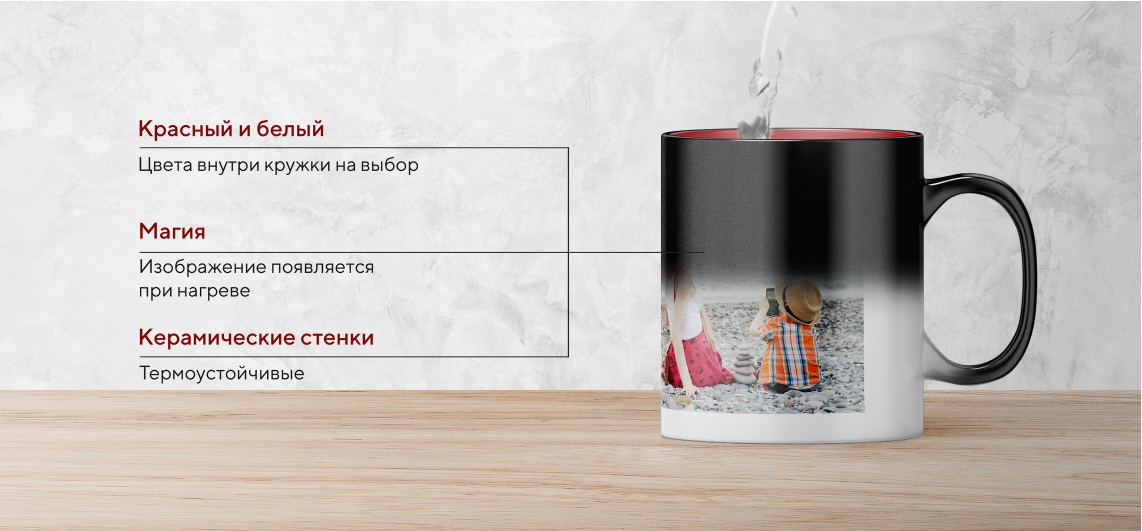 С прохладными напитками остается однотонной черной, с горячими проявится ваше изображение, логотип или надпись. Термочувствительное свойство покрытия керамики дает массу возможностей для создания дизайна. Кружку хамелеон часто выбирают для подарка или в качестве промо сувенира.