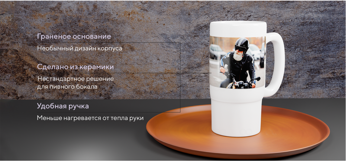 Бокал изготовлен из качественной белой керамики с массивной ручкой и граненым низом.