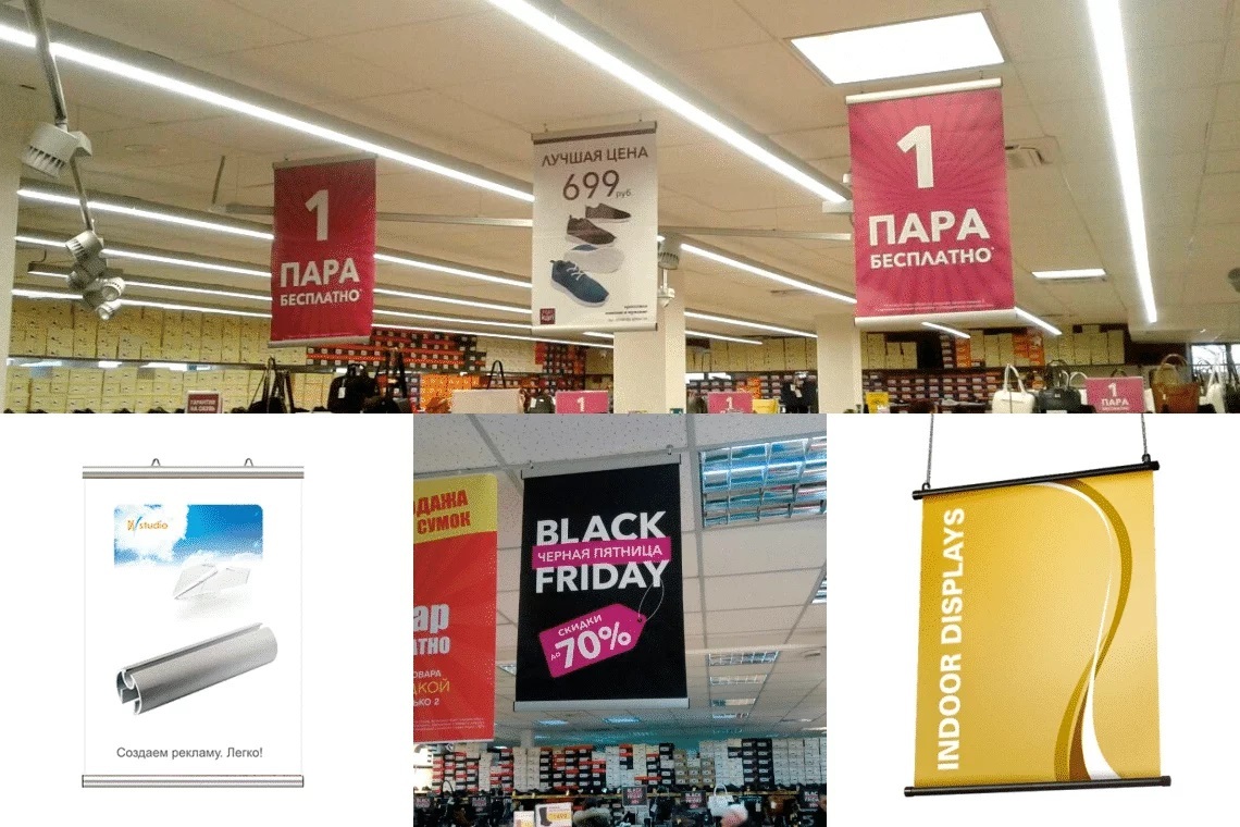 Плакаты на подвесах отлично вписываются в городской ландшафт и имеют множество вариантов расположения. Одним из их достоинств является широкий выбор размеров. Так на одном полотне можно уместить большие объемы графической и текстовой информации. При этом также есть возможность выбрать масштаб, соответствующий размерам полотна и высоте, на которой оно будет вывешено.